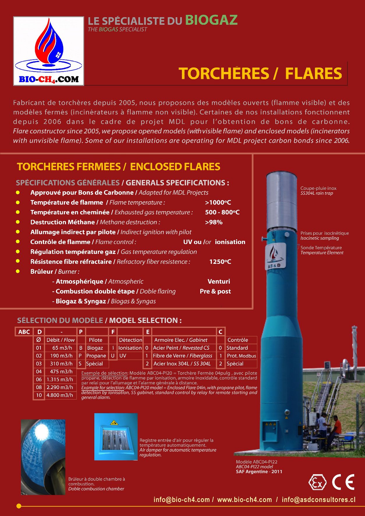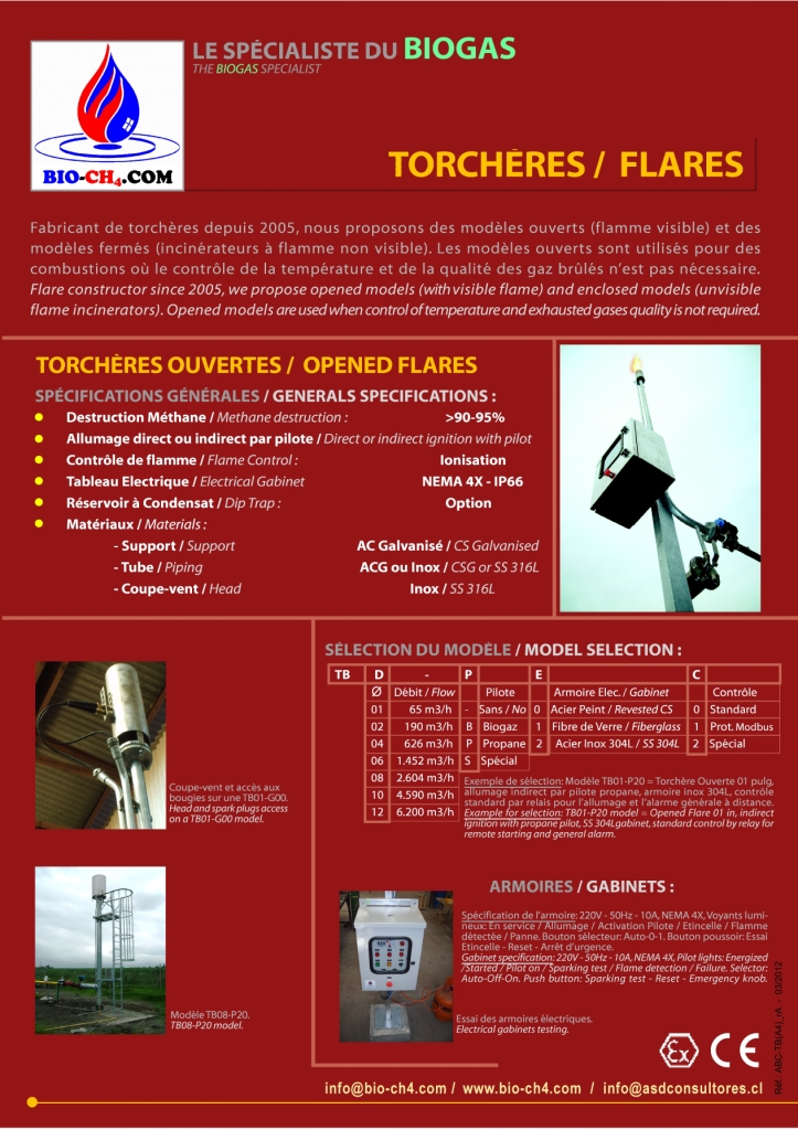 Este tipo de equipo denominado Estación de Combustión Biogás (ECB) han sido inicialmente desarrollado para la obtención de bonos de carbono, permite quemar altos rangos de caudales (turn-down >10), y se compone de módulos de combustión (biotorchas) y de un módulo de control y operación (Ver presentación en pdf)